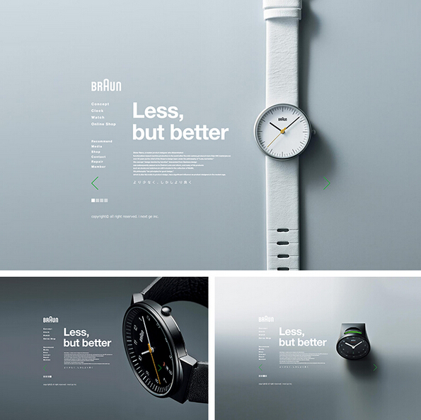 例如:BRAUN博朗,整个页面,简洁的图片与文字的排版,让视线非常集中,这样用户快速的将注意力集中到内容上去,非常符合他们的主题“Less,but better”,给人留下回味、想象的空间。